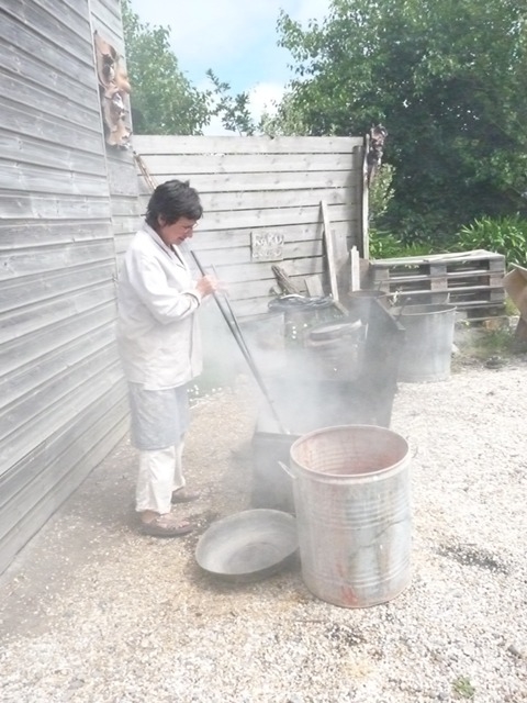 Après avoir retiré les pièces émaillées ,Nannick les jette à l'aide d'une grande pince danune lessiveuse remplie d'eau froide ce qui provoque des zébrures dans l'émail